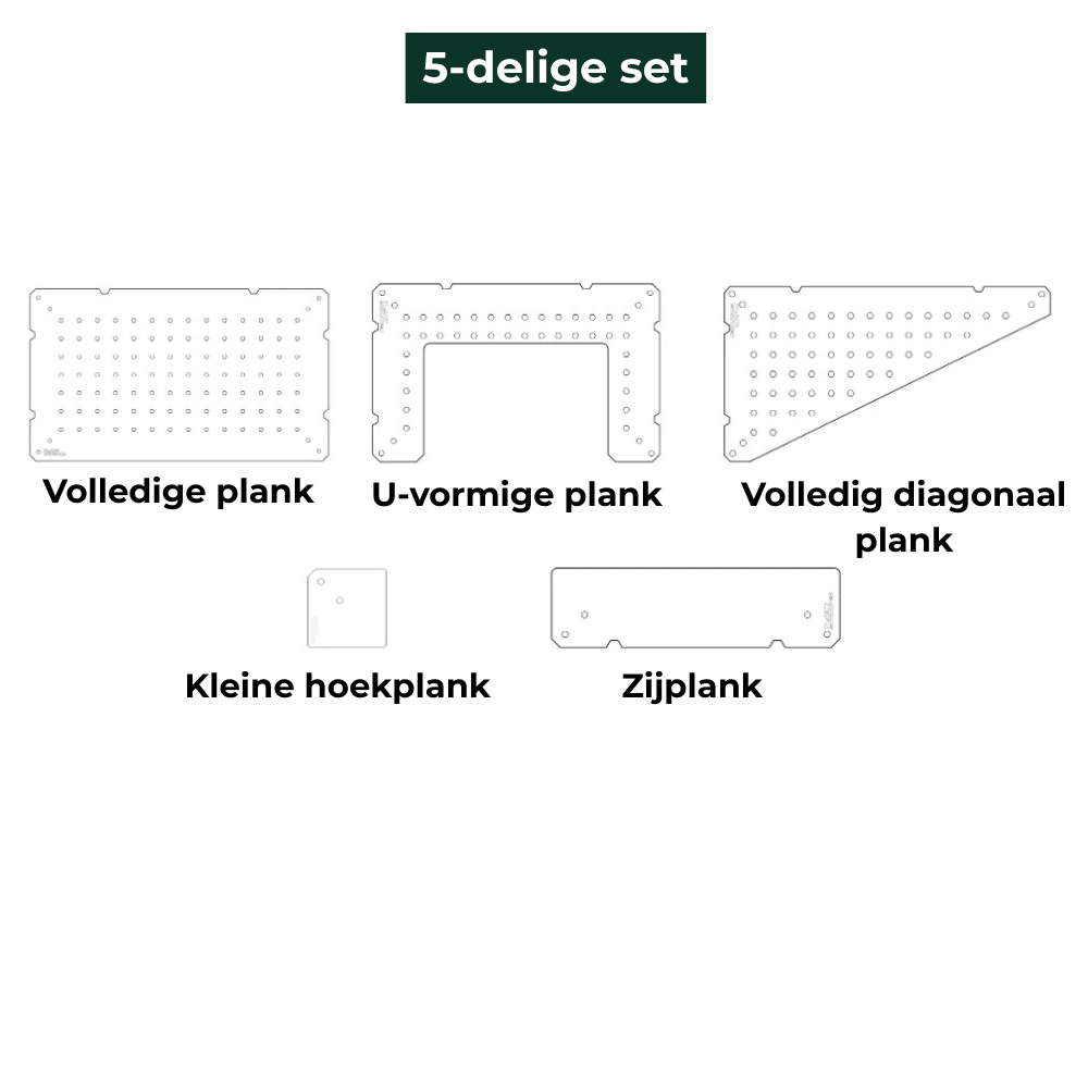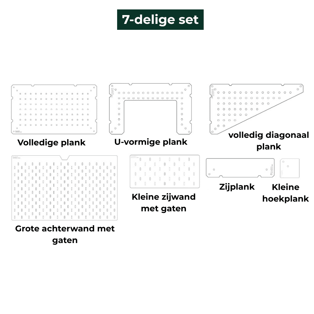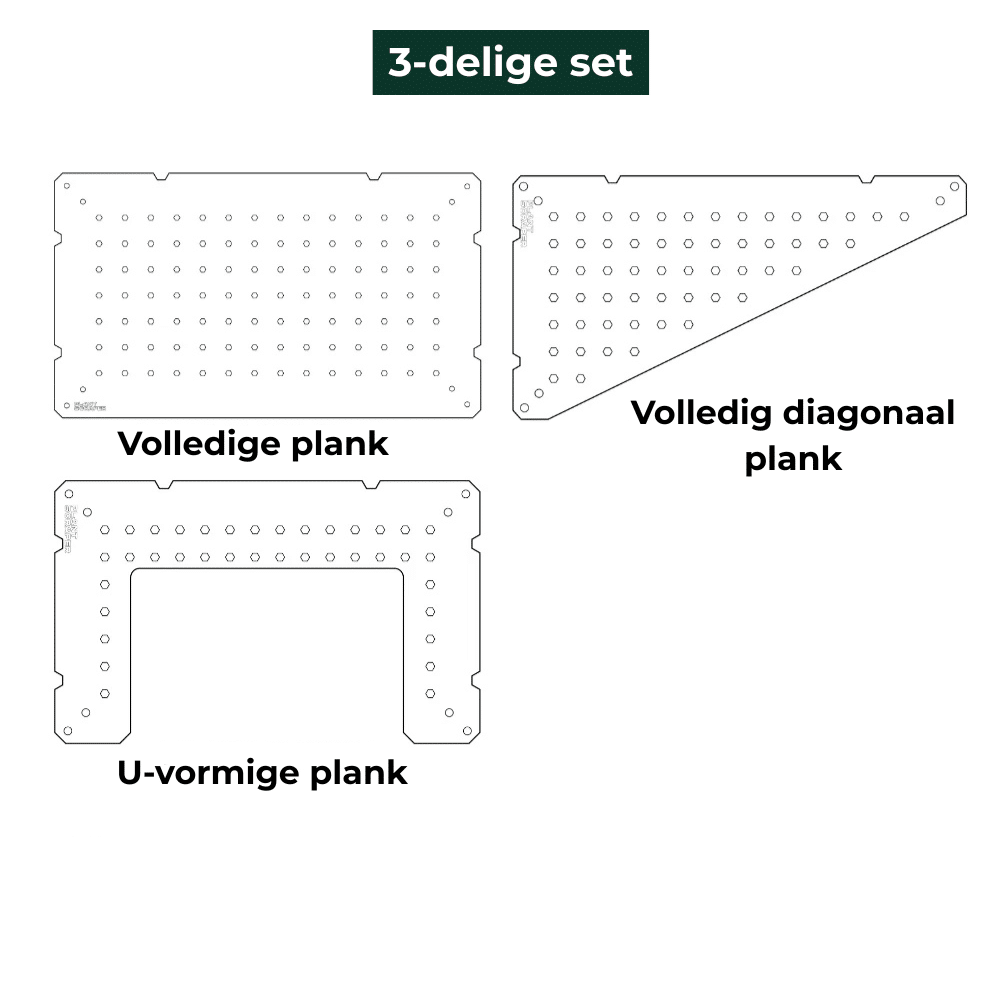 - Dikte: Planken 8 mm / pegboards 3 mm