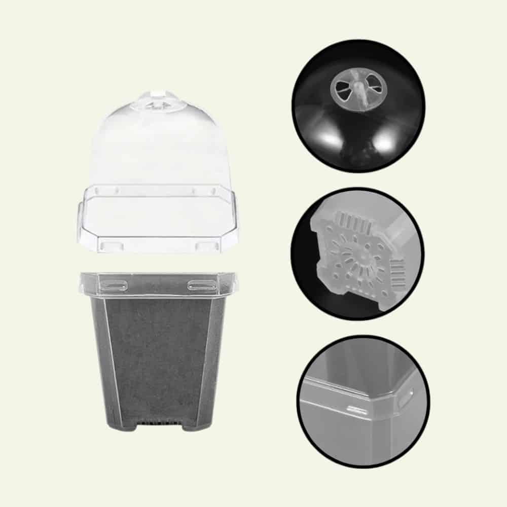 Het deksel houdt een hoge luchtvochtigheid vast en creëert zo een microklimaat dat zorgt voor snellere kieming en wortelontwikkeling.