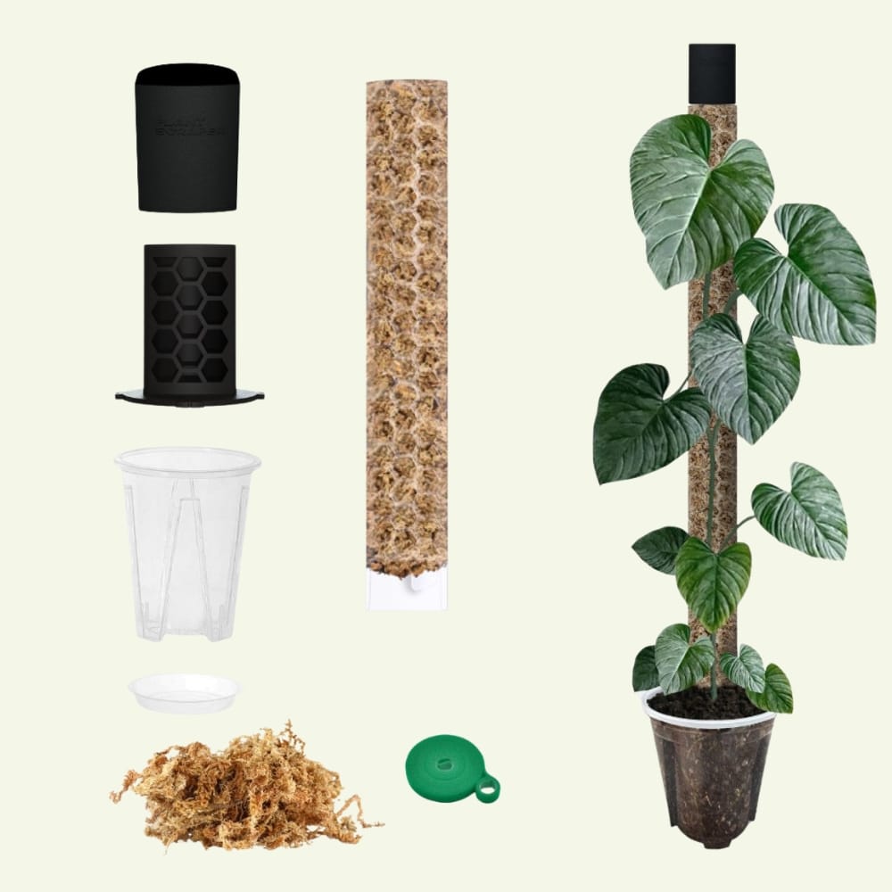 Deze Verankeringsset is niet alleen een Anker – het bevat alle accessoires die nodig zijn voor het kweken van klimmende en kruipende planten, van een stabiele Bloempot tot de juiste begeleiding en de Bewateringsdruppelaar voor mosstokken.